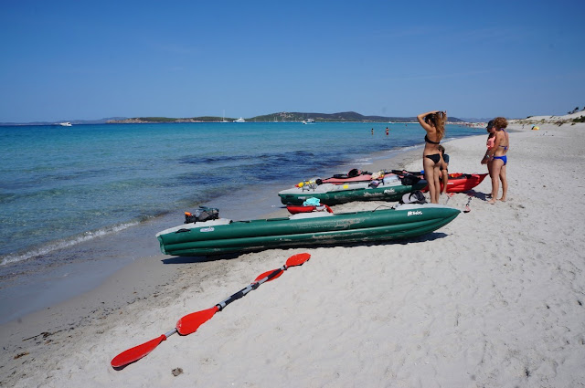 Après la Capo Sperone, nous coupons le Golfo di Palmas (12 km de traversée) depuis la Torre Cannal jusqu'à la Punta Menga. Nous enchaînons ensuite avec le golfe de Porto Pino (4 km). Arrivés sur la très belle plage, Apolline se plaint de douleurs liées aux irritations provoquées par l'eau salée, on décide donc d'arrêter le kayak pour aujourd'hui et on rejoint un camping à Porto Pino, 2 km en arrière (bivouac pas possible, zone interdite, terrain militaire). Le vent se met brutalement à forcir, effaçant ainsi mes regrets de ne pas poursuivre vers le Capo Teulada...